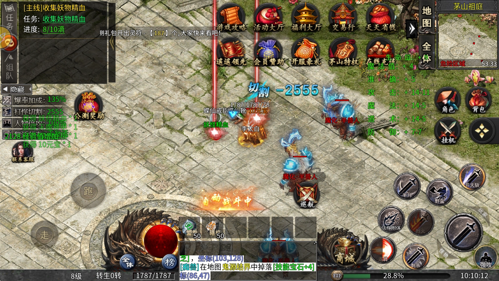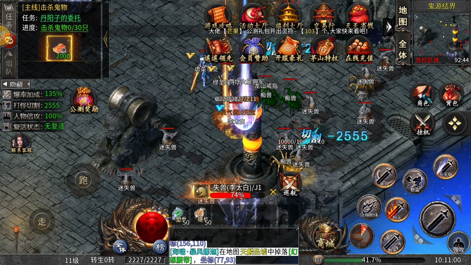 在本服务器里,切割属性的主要获取途径是切割法器。切割法器本身配备了法身附体技能,激活该技能后能提升自身的各项属性。不过在法身附体的状态下,会持续消耗灵气值,而灵气值可以通过击杀怪物来获取。