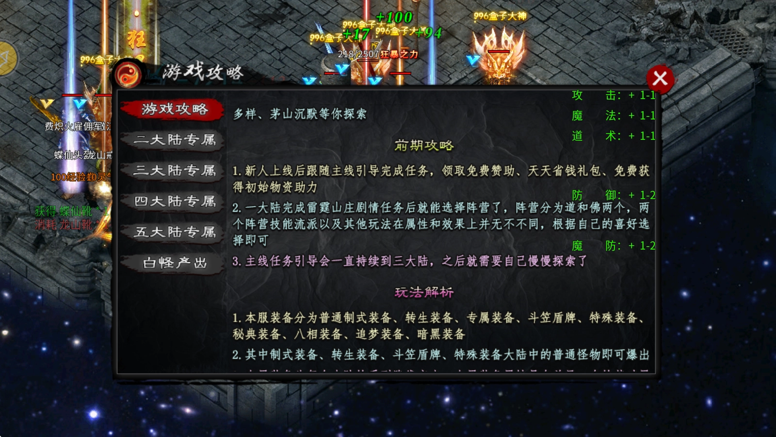 制式装备、转生装备、斗笠盾牌以及特殊装备,在大陆里随便打个普通怪物就有机会爆出来;而追梦装备呢,从一大陆的小怪开始就可能掉落,要是运气好打出一件,那可就直接起飞了。