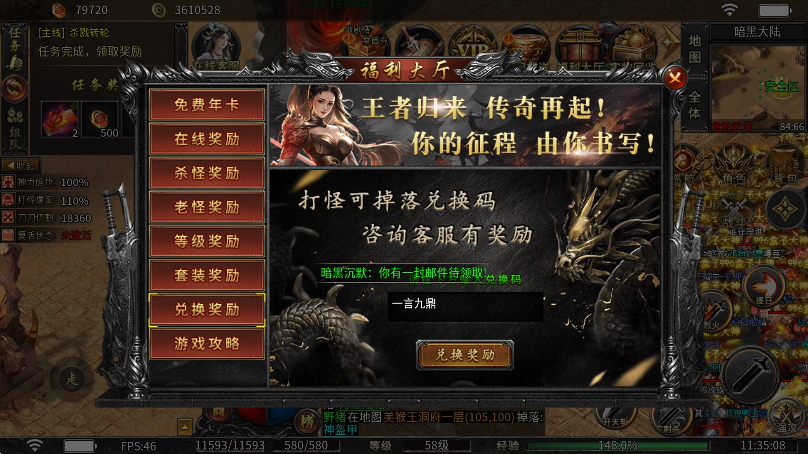 兑换方式:点击上方的福利大厅,再选择兑换奖励,最后输入兑换码就行。