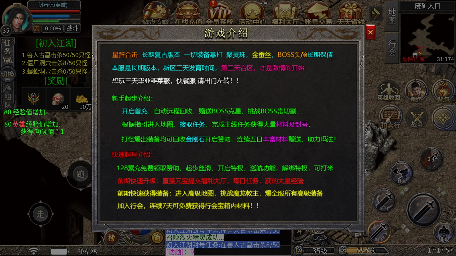 奇兵夺宝、行会争霸、激情泡点、巅峰之战等精彩活动等你参加,奖励大量充值及货币,助您快速起步。