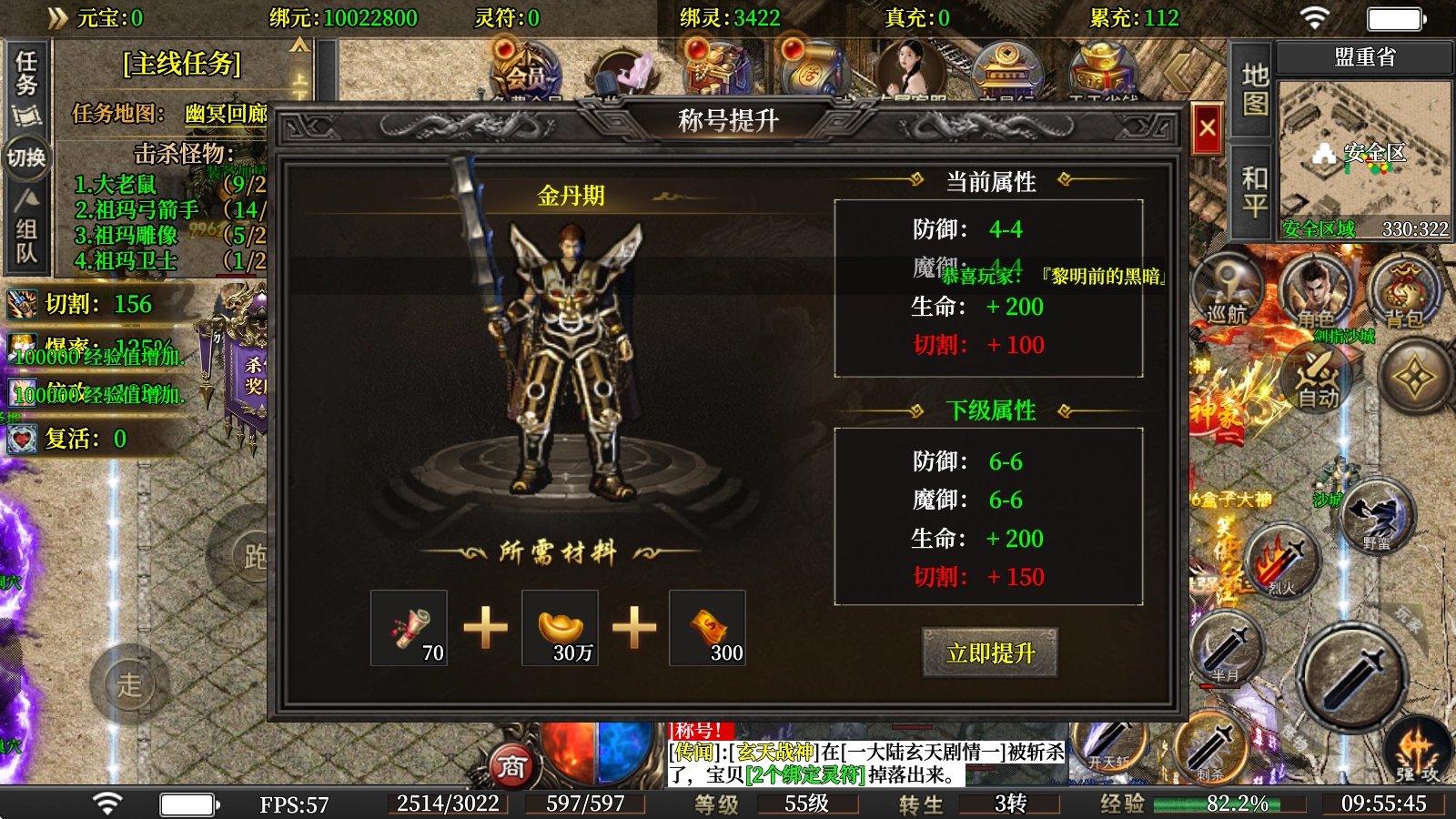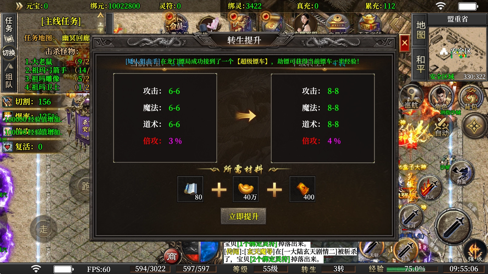 转生使者:消耗转生证明、元宝与灵符即可进行提升,能够增加攻魔道属性与倍攻属性。