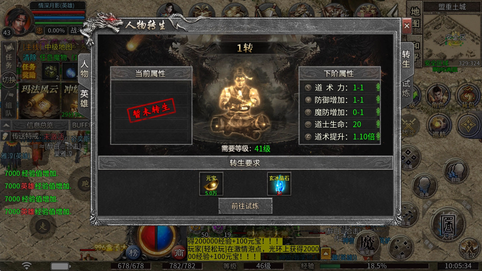转生系统:消耗元宝与玄冰晶石来提升等级,能够让对应职业的属性得到成倍增长。