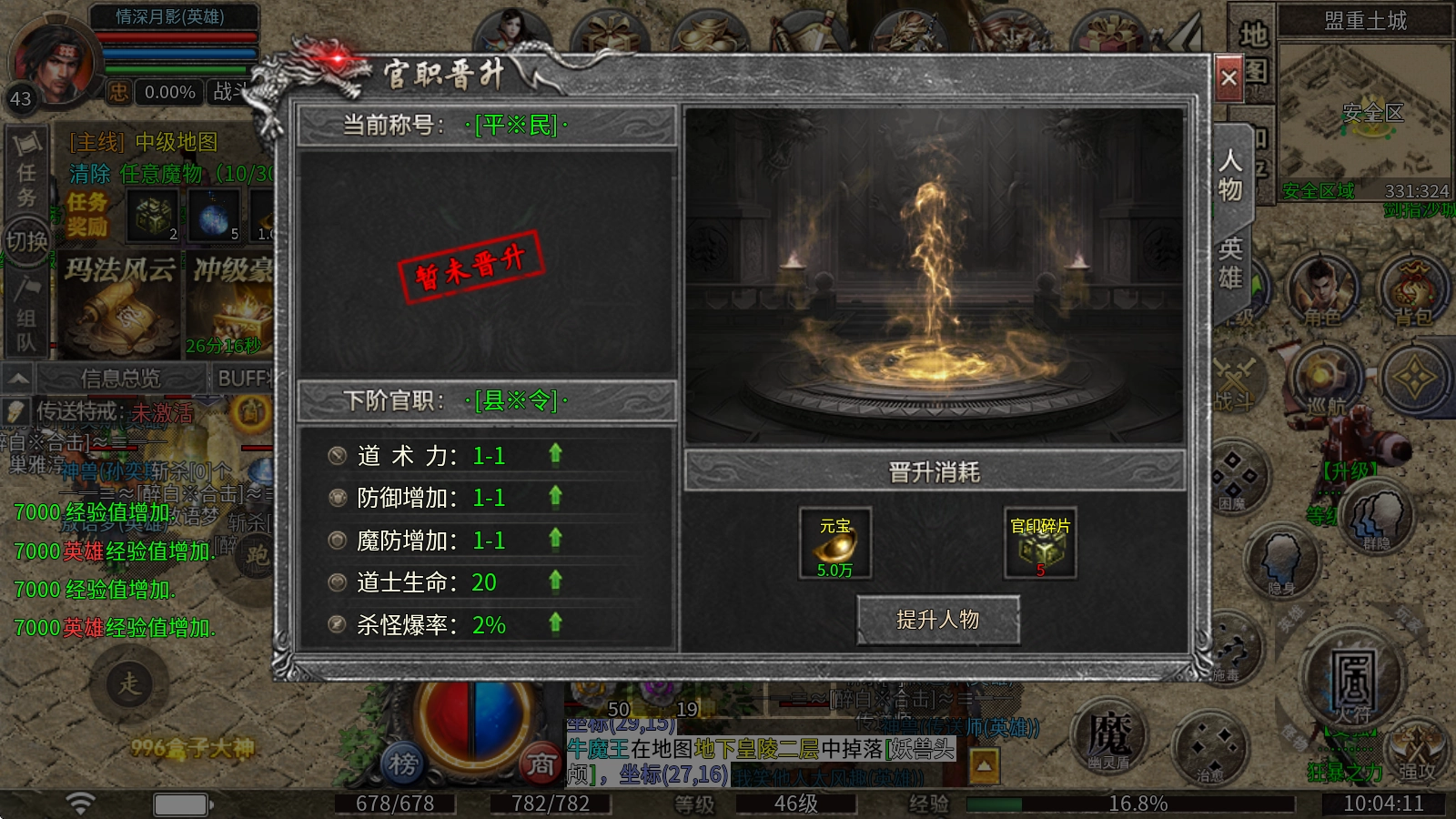 官职晋升:花费元宝与官印碎片就能提升,能够增加杀怪的爆率。