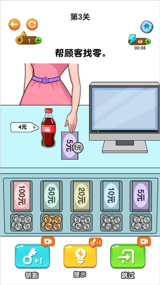 2、同样的方法,只不过这些的商品从口香糖的5块钱变为了冰棍3块钱,将左边的1元钢镚提交两个给顾客。