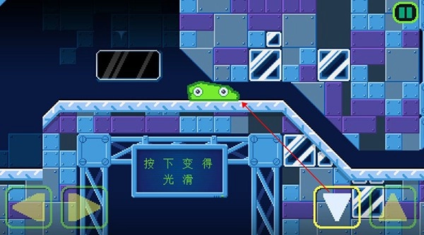 当玩家遇到无法直接通行的狭窄路径时,只需按下收缩键——也就是那个倒三角形状的按钮,史莱姆就会收缩变矮,这样就能顺利通过了。