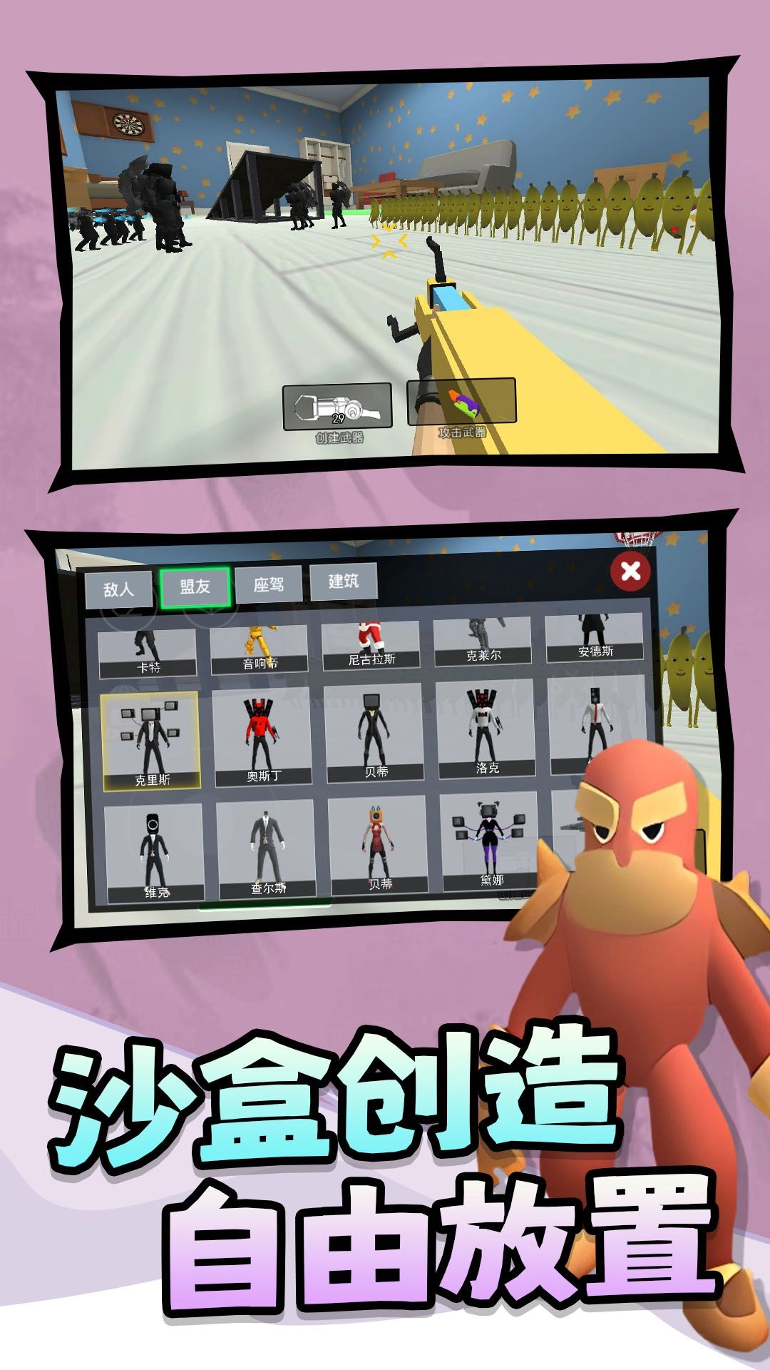 《沙盒战场吃鸡》是一款极具趣味的游戏,它打破了传统射击枪战的玩法框架,融入了大香蕉怪人这类网络热门搞笑元素,为紧张刺激的生存枪战体验注入了别样的趣味。在这个自由度极高的沙盒战场上,玩家不仅要面对敌对玩家的猛烈火力,还需提防随机出现的大香蕉怪人带来的突发挑战,使得每一场对决都充满了未知的惊喜与欢乐!