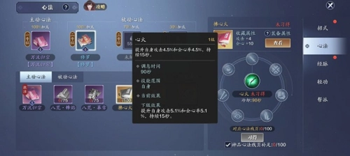 游戏中的心法系统主要包含主动心法与被动心法两类,主动心法同一时间仅能佩戴一个,而且在等级较低时就能解锁,基础心法“万流归宗”同样是初期会赠送的一种心法,这个心法所带来的技能不只是一个大范围高伤害技能,还能对玩家的属性起到提升作用。