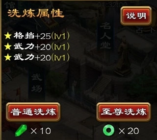 至尊洗练:洗练过程需消耗积分,会随机更改洗练属性的种类,并且有较高概率提升洗练属性的等级。