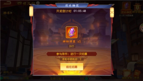 3、抽奖开奖环节,系统将从符合抽奖条件的主公里,随机抽选X名主公,由他们获得本轮奖池的奖品。