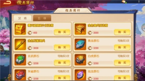 2、主公手中的「丹青残卷」可用于汉将商店兑换珍稀道具与海量资源,汉将碎片任选箱、金色万能神兵、原石、礼记周易等好物,皆可供主公随心挑选; 3、主公获取的「五铢钱」能在五铢商店兑换心仪物品,原石、礼记周易、将星、洗练石、鲛油长明灯、北斗司南、金色万能神兵等海量道具与资源应有尽有。