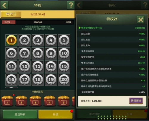 在指挥部界面的左上角,有一个“特权”按钮。我们能够利用成长过程中获取的特权点数,来提升自身的特权等级。特权等级越高,在特权处于激活状态时,我们所能享受到的特权加成也就越丰厚,这对于我们实现快速成长而言,是极为有益的!
