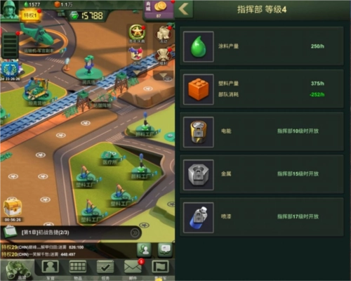 随着进度的推进,我们能够解锁地块来规划涂料、塑料、电能、金属、喷漆这五类工厂以生产资源,与此同时,还会解锁军用帐篷和医疗所,用于提高士兵的训练效率以及救治受伤的士兵。