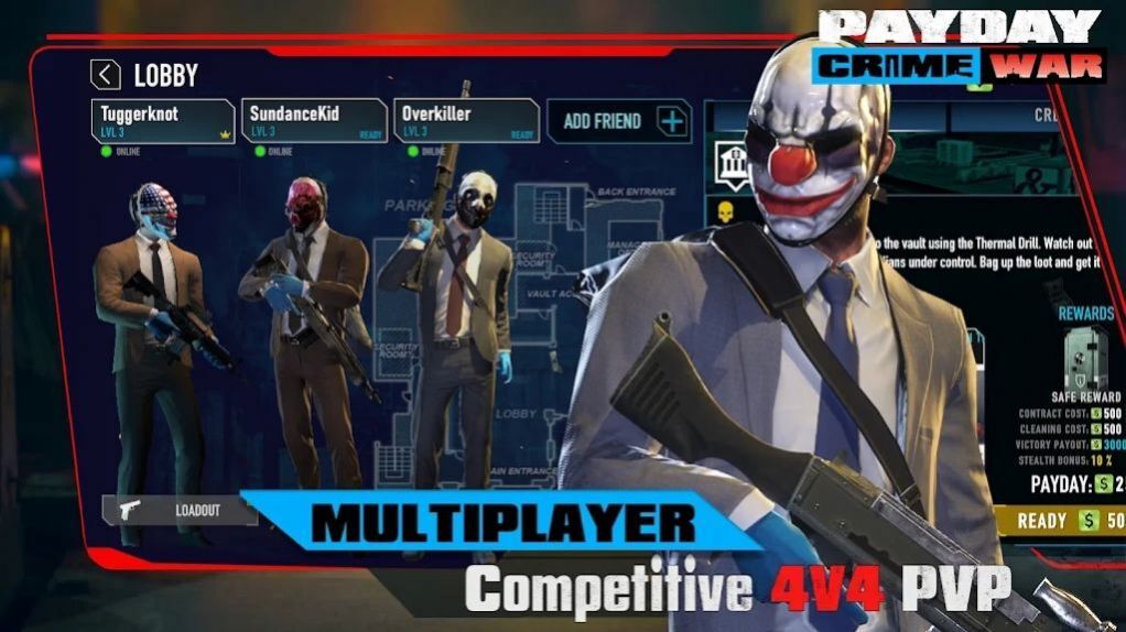 《PAYDAY收获日》是一款充满热血的3D射击枪战游戏。它以第一人称视角为特色,玩家进入游戏后将开启紧张刺激的射击对抗。游戏提供了丰富多样的地图模式,玩家可以在地图的各个角落搜寻装备和武器,通过灵活切换不同武器与敌人展开激战。击中敌人要害将其淘汰即可获得分数,最终成功存活到最后的玩家就是冠军。