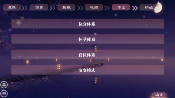 9)体系设定:自由模式开局时,玩家可自主选择设定为富庶强盛的国家,或是处于危亡、积弊状态的老旧政权;后宫位分体系支持自定义:可自行设置位分名称、对应的月俸标准、各层级人数限制以及势力权重,还能将这些设置保存为模板,一次配置完成后,所有存档均可直接套用该模板。