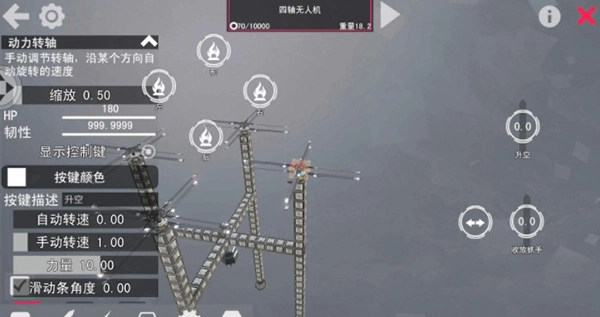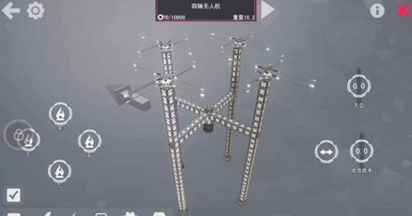 完成后,最关键的一步随即到来:我们需要点击机械名称旁的按钮,让机械进入模拟场,以此测试它的运动状态。将旁边的飞行按钮向上拉动,就能测试飞行状态。之后,根据出现的问题,调整不同零件的参数。有的人的飞行器可能飞不起来,有的人的会偏离直飞轨道,还有像我这样一着陆就散架的情况……遇到这些状况不必担心,只要合理排查问题所在,调整螺旋桨扇叶的参数,或者检查机械连接是否牢固,就能轻松解决。