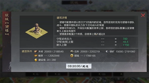 此次更新取消了升级望楼所需的政令消耗。其玩法与流浪军的上墙队相同,需在已占领的地块上建设,且支持升级。当多个望楼的范围重叠时,部队只会与其中一个望楼发生交战;若望楼与城池范围重叠,部队攻击城池时则不会与望楼交战。