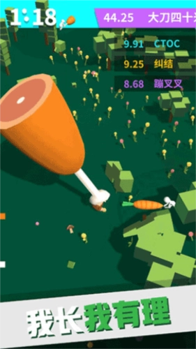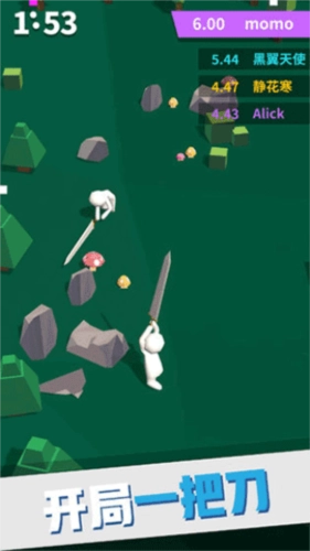 这款游戏的玩法相当简单休闲,开局会给你一把刀,但后续不一定一直用刀,斧头、大棒之类的武器都可能出现。你需要在这个有限的世界里不断劈砍,不管是砍树还是砍其他玩家,都能让你的武器长度增加——不过砍人加得更多,砍树加得少。游戏时长为2分钟,只要没阵亡,谁的武器更长谁就能获胜。