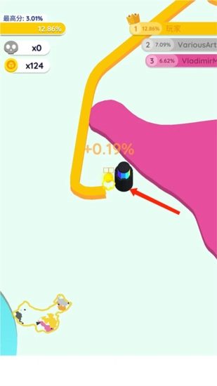 3、用手指拖动方块,让滑动的方块沿着现有地盘边缘围成一个闭合的圈,圈闭合后会变成和你地盘相同的颜色,此时会出现【+0.46%】的提示,你的地盘面积就随之扩大了。