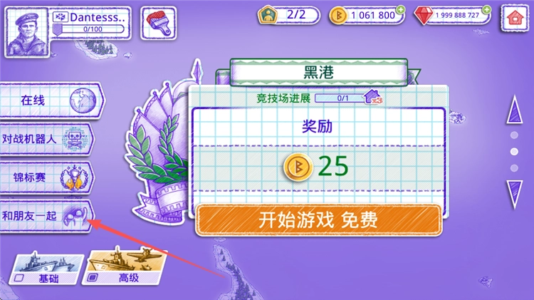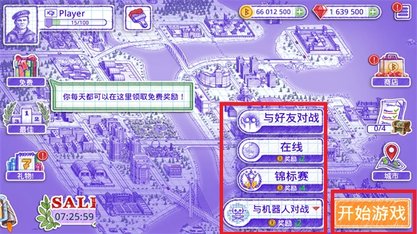 1、主页面提供多种玩法选项,包括与好友对战、在线匹配、参与锦标赛以及和机器人对战等,当前默认选择与机器人对战,点击“开始”即可进入游戏。