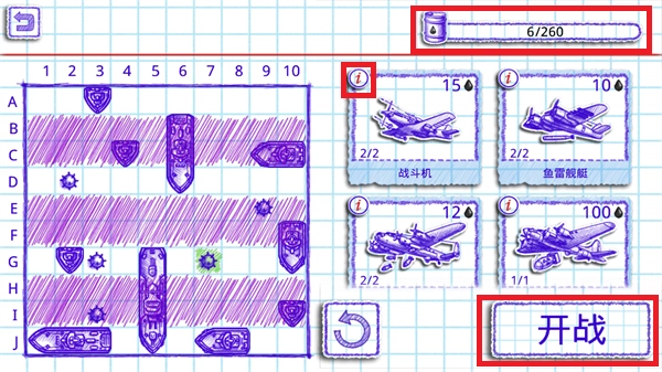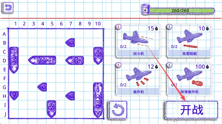 4、这里为玩家提供了石油资源,可用于购买各类道具、战机和潜艇。不同的道具有着不同的用途,有的具备防空功能,有的则是陷阱类道具。若想了解道具的具体功能信息,点击道具左上角的红色“i”标志即可查看。当完成道具购买后,点击“开战”按钮即可进入战斗。