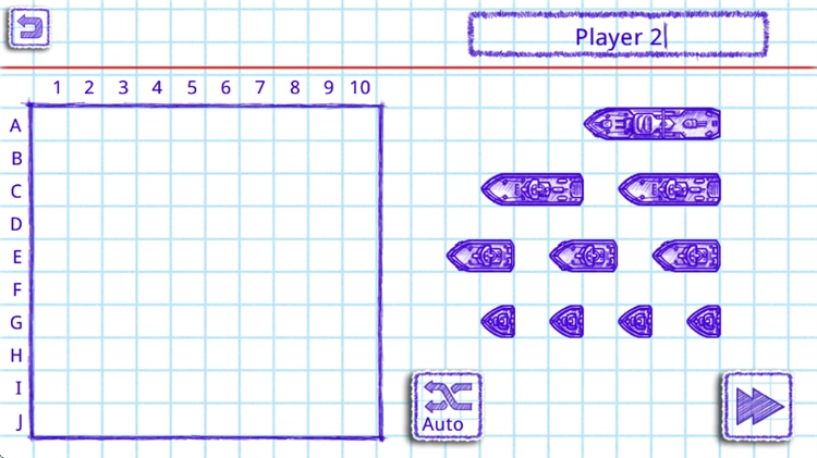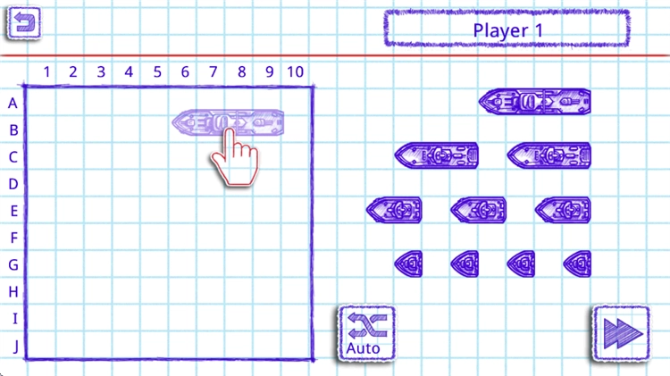 3、这里为玩家准备了若干战舰,把它们拖到左侧坐标框里就能查看战舰的受击范围。你可以自行调整排列顺序,也能点击Auto按钮让系统自动随机排序。排序结束后,可点击坐标框右上角的保存图标来保存当前模板,或者直接使用已有的模板进行排列,最后点击右下角的箭头就能进入下一步操作。