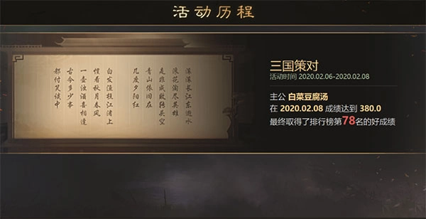 个人征程界面会新增“活动历程”入口,点击该入口就能查看活动相关的历史记录。活动历程会记录主公参与过且有排行榜排名记录的活动。