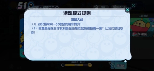猫咪想要赢其实比较容易,毕竟两边都没什么特殊技能,所以用4只猫围堵1只老鼠的“4包1”策略优势会很大。不过呢,双方的移动速度也差不多(顶多因为天赋不同有一点点差别),要是光在后面追着老鼠跑,那也很难真的追上。