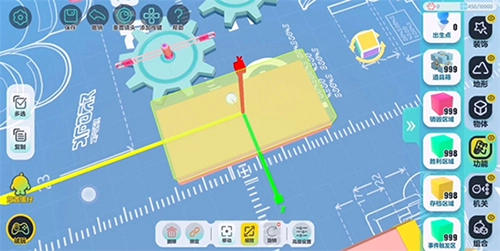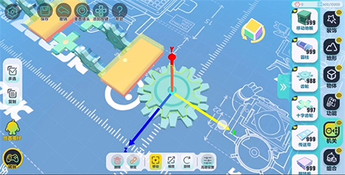 为了操作更便捷,在正式搭建前,需要把设置里的编辑视角切换成【上帝视角】。在机关栏找到“齿轮”组件并拖拽出来,就能完成“齿轮”的基础摆放操作。除了常规摆放,还可以点击【旋转】按钮让“齿轮”竖起来,也能通过调整【缩放】参数来改变“齿轮”的大小和侧面宽度。等尺寸调整好后,点击左侧的【复制】按钮,就能批量复制已调好的组件,这样可以节省时间、提升效率。