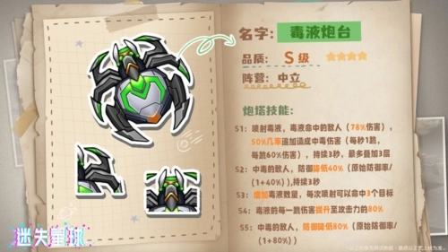 S1:喷射毒液,被毒液命中的敌人将受到78%伤害,且有50%的几率额外触发中毒效果——每秒造成60%伤害,持续3秒,该中毒效果最多可叠加3层。