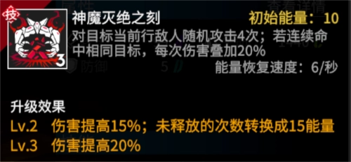 狩猎者释放大招时,会对目标当前所在行的敌人随机发起4次攻击;要是连续命中同一个目标,每次伤害都会叠加20%,所以当狩猎者大招的4次攻击都打在同一个敌人身上时,伤害能达到最高。根据这个特点,狩猎者通常会选择对位横排上敌人数量较少的位置;当然,在极限情况下也可以依靠运气来实现命中同一个敌人的目标,不过要注意活力值是否充足哦。由于大招具备高爆发输出的特性,狩猎者可以调配更多攻击和大招威力属性来增强大招伤害,同时狩猎者初始能量和能量恢复速度较低,搭配能够增加大招威力和回能的手办,能有效提升大招的输出效率。大招升级后,未释放的次数可以转化为能量,加快下次大招的释放,再也不用担忧大招伤害会无限溢出了。