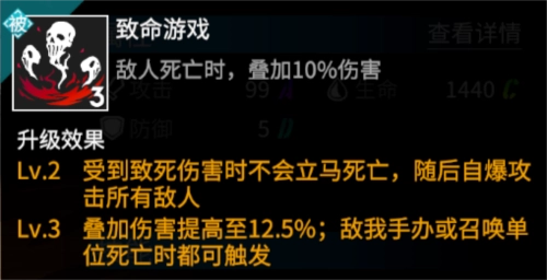 战斗时,场上每有一名敌人死亡,狩猎者就会叠加10%的伤害。因此,当敌人数量较多时,只要狩猎者存活,就能越战越勇,伤害叠加上限为10层。被动技能升至2级后,狩猎者受到致死伤害时不会立即死亡,而是会触发自爆,对所有敌人发起攻击。若此时被动已叠加部分伤害,且面对大量敌人,自爆将造成相当可观的伤害效果。被动技能升至3级后,不仅叠加伤害的效果得到进一步提升,触发条件也扩展为敌我双方的手办或召唤单位死亡时均可生效,这让狩猎者能够与召唤流派的手办形成良好搭配。
