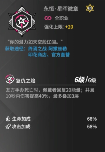 如前所述,由于狩猎者大招的特性,它比较适合搭配大招威力、攻击或暴击套装,以此最大化输出能力。徽章选择上,推荐佩戴星辉徽章来进一步增强狩猎者在残局中的翻盘能力——星辉徽章不仅能让狩猎者叠加更多伤害,还能补充其稀缺的能量;熟悉游戏的玩家应该清楚,最终能否翻盘往往取决于能否放出最后一个大招。除此之外,其他提升大招威力的徽章也是不错的选择。
