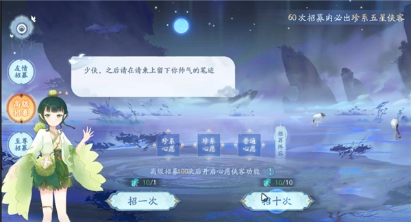 4、高级招募具备保底机制,累计六十次招募必定能得到一名五星侠客。五星侠客是初始星级最高的,实力也相当强悍。除了保底之外,高级招募还设有心愿单功能,在招募满一百次后解锁。解锁后可以选择三个目标侠客,之后招募到对应星级的侠客时,心愿单上的侠客会被百分百抽中。