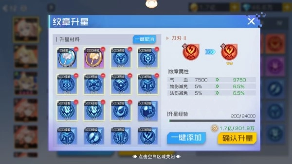 纹章能够通过升星来提升基础属性,纹章的品质越好,可升星的上限就越高,最高能达到5星。升星所积累的经验可以无损转移给其他纹章。