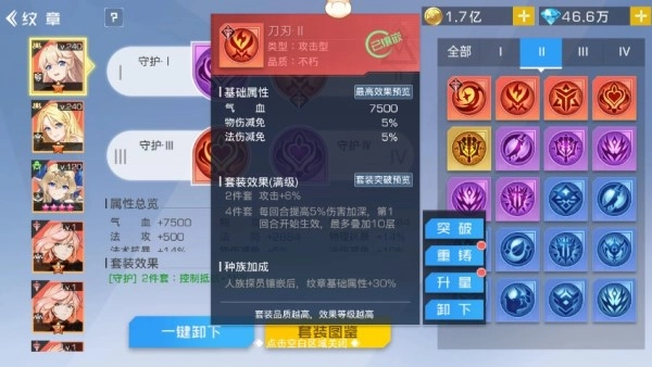 不朽品质的纹章支持突破操作,突破后其基础属性会得到显著提升。纹章按功能划分为攻击型、防御型和辅助型三类,不同类型的纹章进行突破时,需消耗对应类型的铭文材料。首次突破后,纹章品质将升级为T1,再次突破则进一步提升至T2。当镶嵌2件同名的T1级纹章时,可激活2件套T1效果:额外增加5%全能属性;若镶嵌4件同名的T2级纹章,则会触发4件套T2效果,该效果在原有4件套效果的基础上有所增强,具体变化依据初始4件套效果而定。