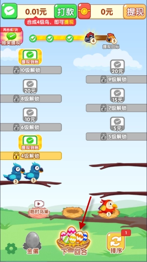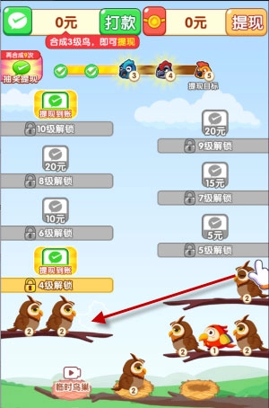 2、同一树梢上凑齐三只相同的小鸟就会自动合成,解锁新的小鸟,还能获得红包奖励。