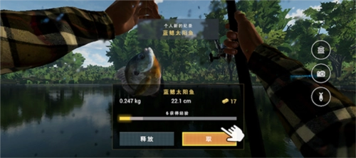 7、当鱼儿再次咬钩时,需要迅速同时长按右下角和左下角的按键,这样就能成功钓到一条鱼了。