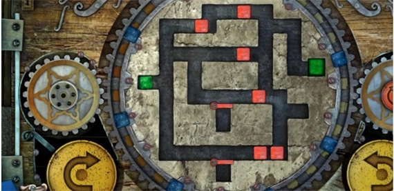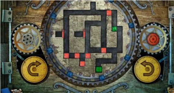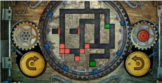 9、点击左侧的黄色按钮一次,大齿轮便会顺时针转动一圈,转动后所有立方体的位置如图所示。