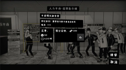 2、玩家需要前往游戏里的人力市场,承接各类“打工”任务。这些“打工”任务在耗时、难度和报酬方面各有不同,玩家得仔细挑选才行。要是去得晚了,人力市场里那些不错的“日结”工作可就没啦!
