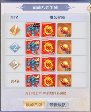 巅峰大奖包含巅峰八强和最佳战队奖励两部分。其中,巅峰八强是每周累计通关层数排名前八的玩家;最佳战队奖励则授予战队模式下闯关排名前五的战队。巅峰大奖的结算时间为每周日22:00。若出现通关层数相同的情况,将以达成该层数时的战力作为排名依据,战力越高则排名越靠前;若战力也相同,则用时较短的一方排名更靠前。