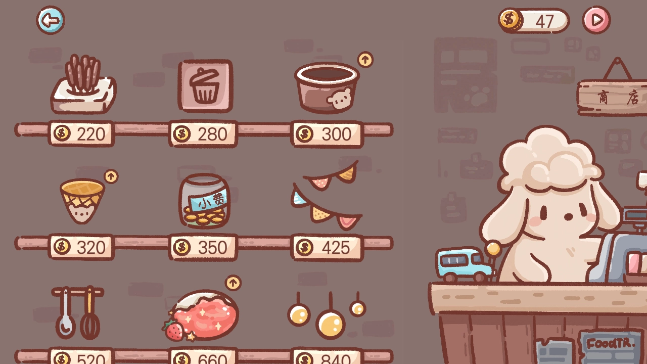4、你能够在商店里进行购物和进货,用售卖冰淇淋所赚取的收入,从我们那位友善的绵羊店老板手中购置新的、更优质的冰淇淋设备。你还可以获取新的冰淇淋配料,像樱桃、百奇棒以及巧克力威化饼干,以此升级冰淇淋的口味,并且能得到全新的抹茶制作机!