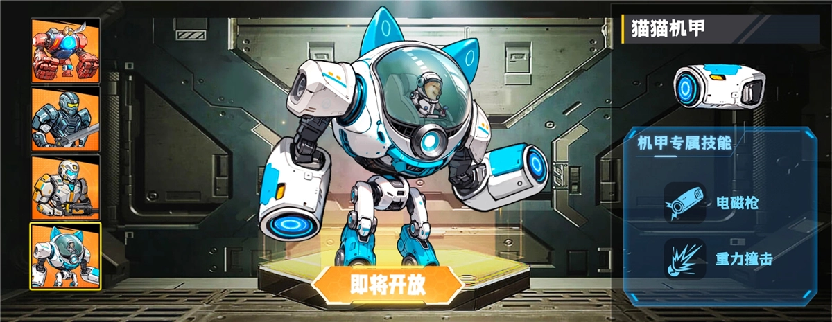 进度:当前状态显示为“即将开放”,专属技能组合是电磁枪搭配重力撞击,期待后续解锁!