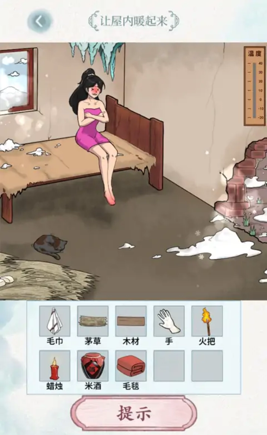 2、在那间破旧的屋子里,此刻女主角正冻得瑟瑟发抖,你打算怎样借助这些道具来帮她取暖呢?