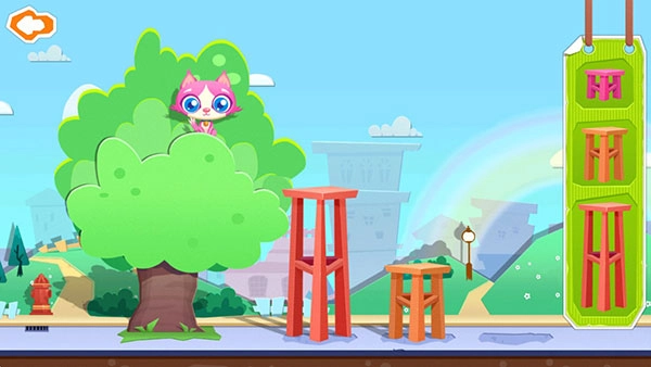 6、只是小猫受了惊吓,不敢从树上下来。别担心,把右边的凳子从高到低拖到指定的地方,给它搭个梯子!太好了,猫咪安全地跳下来了。