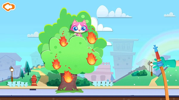 5、哎呀,不好!原来是着火了,还有只小猫被困在树上。小伙伴们,快帮消防员糖糖搭把手,拖动右边的水管,对准火团。太棒啦!大火终于熄灭了!