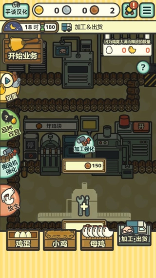 5、到了夜晚,就是升级设备、拓展新流水线与食品机器、改良鸡种的时间了,你还能主动观看广告来获取一笔相当丰厚的资助金。游戏采用金币、银币、铜币三种货币的系统,它们之间的进率均为1000,这样能很好地避免中后期花费数额因0太多而让人数不清的烦躁感。
