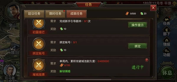 2、完成教程后随便开一局常规剧本,就能看到右侧的任务图标啦~里面的限时任务(需看广告)和成就任务,都是后续免费获取资源的主要途径之一。玉符广告每天能看6次,每次4个玉符,4×6=24个;另外累计看广告还能完成“日积月累”任务,获得礼券,礼券可替代部分玉符的消费功能~