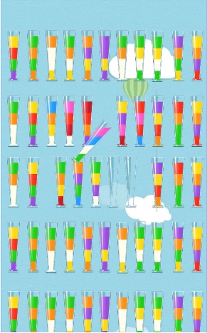 规则看上去不难,玩家要把各种颜色的果汁进行分类,等所有相同颜色的果汁都在同一根试管里时,这一关卡就算完成了。
