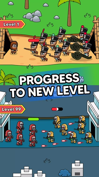 战斗进化战术战争是一款画风可爱的策略战争游戏,玩家在游戏中会经历不同的时代,每个时代都能解锁独特的武器和兵种参与战斗,体验从石器时代到火器时代的历史变迁,玩法十分有趣。游戏操作简单,玩家只需通过策略布置即可完成闯关。