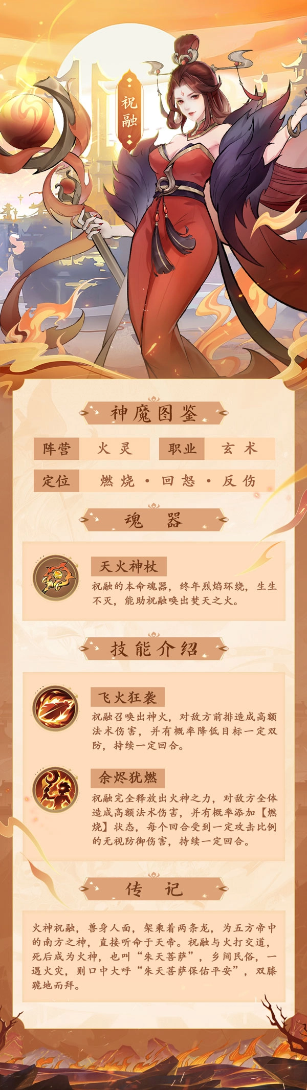 祝融是火系输出的神级卡牌,在队伍里担当核心输出角色,具备强劲的群体输出与群体点燃技能。